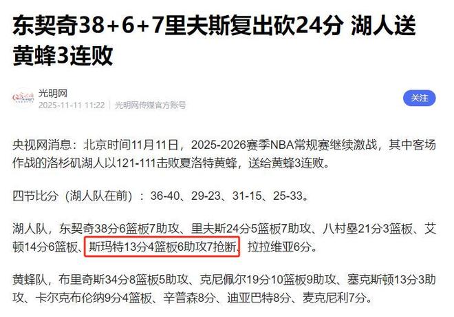 在这7次抢断里,有3次是他直接发起快攻反击,为湖人拿下关键分数,把黄蜂的进攻节奏搅得支离破碎。更难得的是,他在防守拉满的同时,进攻端也毫不含糊,贡献13分3篮板4助攻,真正做到了攻防一体。