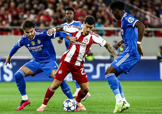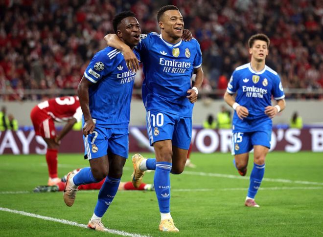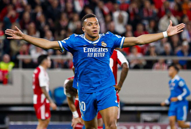欧冠联赛阶段第5轮小组赛展开争夺,皇马做客挑战奥林匹亚科斯。皇马在联赛取得10胜2平1负的成绩,排名榜首,只比身后的巴萨多了1分。近段时间皇马状态比较差,连续3场比赛都没有赢,先是在欧冠输给利物浦,随后在联赛接连战平巴列卡诺和埃尔切。这次出征欧冠,皇马面对的是实力比较弱的奥林匹亚科斯。结果竟然踢出了大比分,皇马还是笑到了最后,惊险拿下比赛。皇马排出4231阵型。姆巴佩顶在最前面。维尼修斯、居莱尔和巴尔韦德的进攻三叉戟联袂出击。卡马文加和楚阿梅尼组成双后腰。费兰-门迪、阿尔瓦罗-卡雷拉斯、劳尔-阿森西奥和阿诺德4后卫首发出战。卢宁担任首发门将。罗德里戈、贡萨洛-加西亚和贝林厄姆坐在替补席待命。比赛刚开不久,维尼修斯内切远射,门将极限扑救化解险情。4分钟后,波登斯任意球直接射门,踢高了。第8分钟,皇马丢球了。奇基尼奥在禁区前沿抽射破门。第19分钟,奇基尼奥在禁区内的抽射被门将神扑化解。3分钟后,皇马进球扳平比分。维尼修斯送出妙传,姆巴佩前插,在禁区前沿起脚低射,皮球从门将裆下穿过去,钻入球门!第24分钟,皇马再次进球。依然是姆巴佩的进球,他接到居莱尔的传中球,头球顶进。皇马反超比分。5分钟后,姆巴佩又进球了!卡马文加送出过顶长传球,姆巴佩前插,单刀推射破门。姆巴佩7分钟内上演帽子戏法,真是太强了。第33分钟,维尼修斯远射破门,但因为此前姆巴佩越位,进球无效。随后,楚阿梅尼远射击中了横梁。半场结束,皇马3-1领先奥林匹亚科斯。下半场易边再战。第52分钟,皇马丢球了。塔雷米抢点头球顶进。5分钟后,维尼修斯突入禁区后的射门被挡出。第59分钟,维尼修斯在边路突破,随即送出倒三角回传球,姆巴佩直接推射破门,完成大四喜!第81分钟,奥林匹亚科斯再次缩小差距。卡埃比头球顶进!之后卡埃比的射门踢偏,错失了绝平的机会。最终,皇马4-3险胜奥林匹亚科斯。姆巴佩5场欧冠打进9球,刷新个人单赛季欧冠进球纪录。