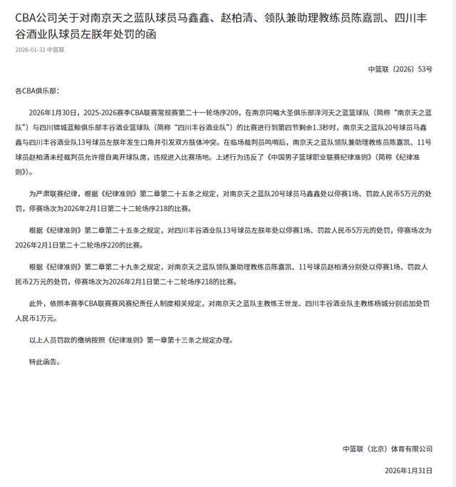 2月1日上午,CBA公司发布公告,因临近比赛结束时发生冲突,同曦男篮球员马鑫鑫被停赛1场且罚款人民币5万元;四川男篮球员左朕年被停赛1场且罚款人民币5万元;同曦男篮领队兼助教陈嘉凯、球员赵柏清分别被停赛1场且罚款人民币2万元;依照本赛季CBA联赛赛风赛纪责任人制度相关规定,同曦男篮主教练王世龙、四川男篮主教练杨城分别被追加处罚人民币1万元。