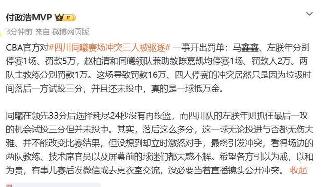 事件冲突回顾:CBA常规赛第21轮,南京同曦主场104-72大胜四川的比赛第四节最后阶段,在同曦球员最后一攻已经示意不打的情况下,四川球员左朕年却在最后读秒阶段出手三分,引来了同曦球员马鑫鑫的严重不满,双方发生了激烈口角,爆发激烈肢体冲突,左朕年一把推倒了马鑫鑫,将矛盾升级。