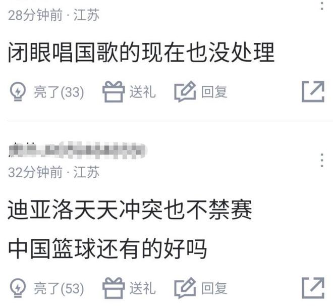 另一部分球迷则对CBA表达了不满,分别拿了迪亚洛和前段时间在奏唱国歌仪式中没有行注目礼的徐远征来说事:迪亚洛天天冲突也不禁赛,中国篮球还有的好吗?闭眼唱国歌的现在也没有处理!