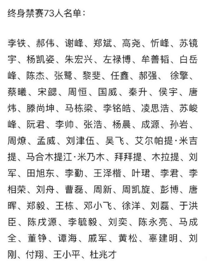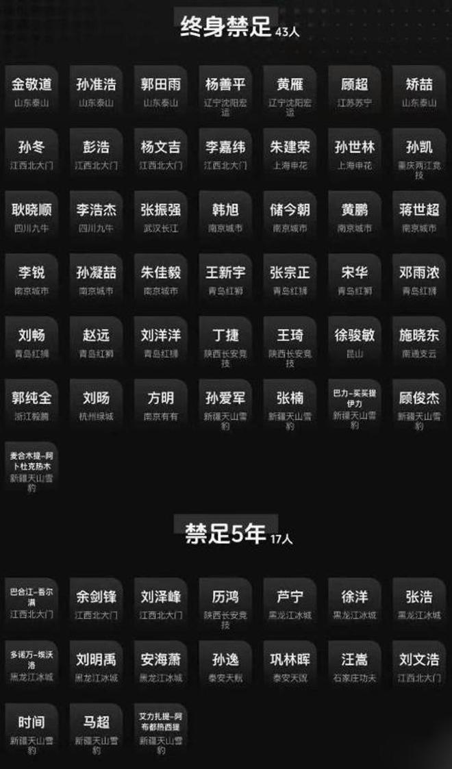 国家体育总局、公安部、中国足协联合处罚,半数球队新赛季将被扣分,73人遭终身禁赛。共13家俱乐部受惩。中超16支球队中有9支,外加中甲4支球队,因涉及多年假球、非法赌球行为遭到处罚,新赛季将被扣分。中超三连冠得主海港被扣5分,申花、浙江、国安、三镇等队都遭处罚。